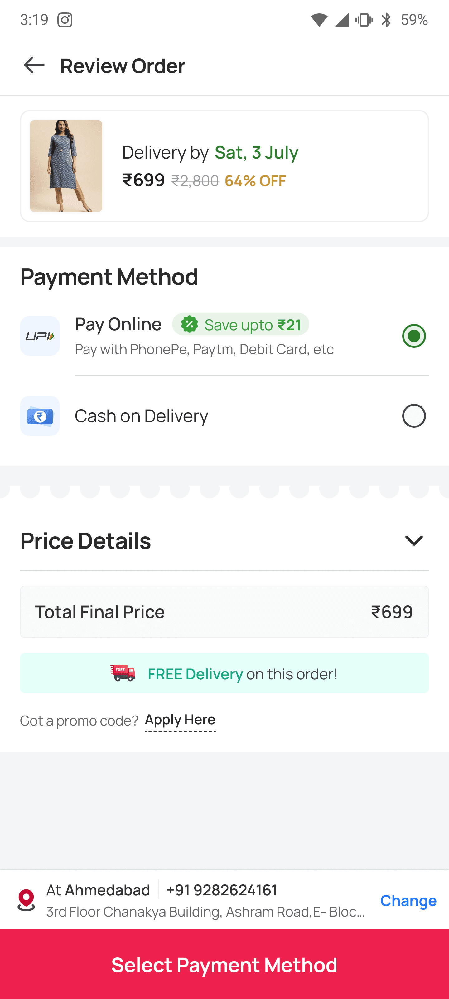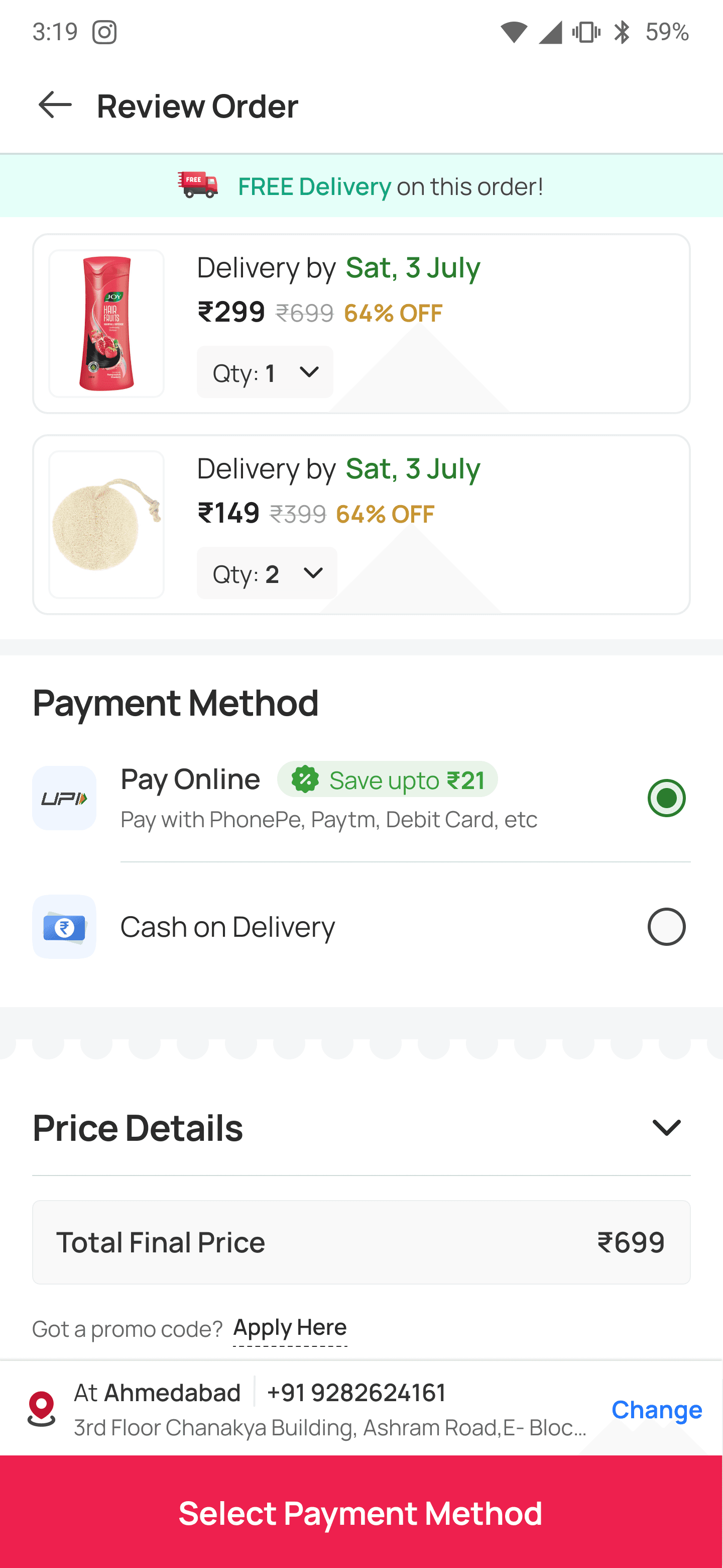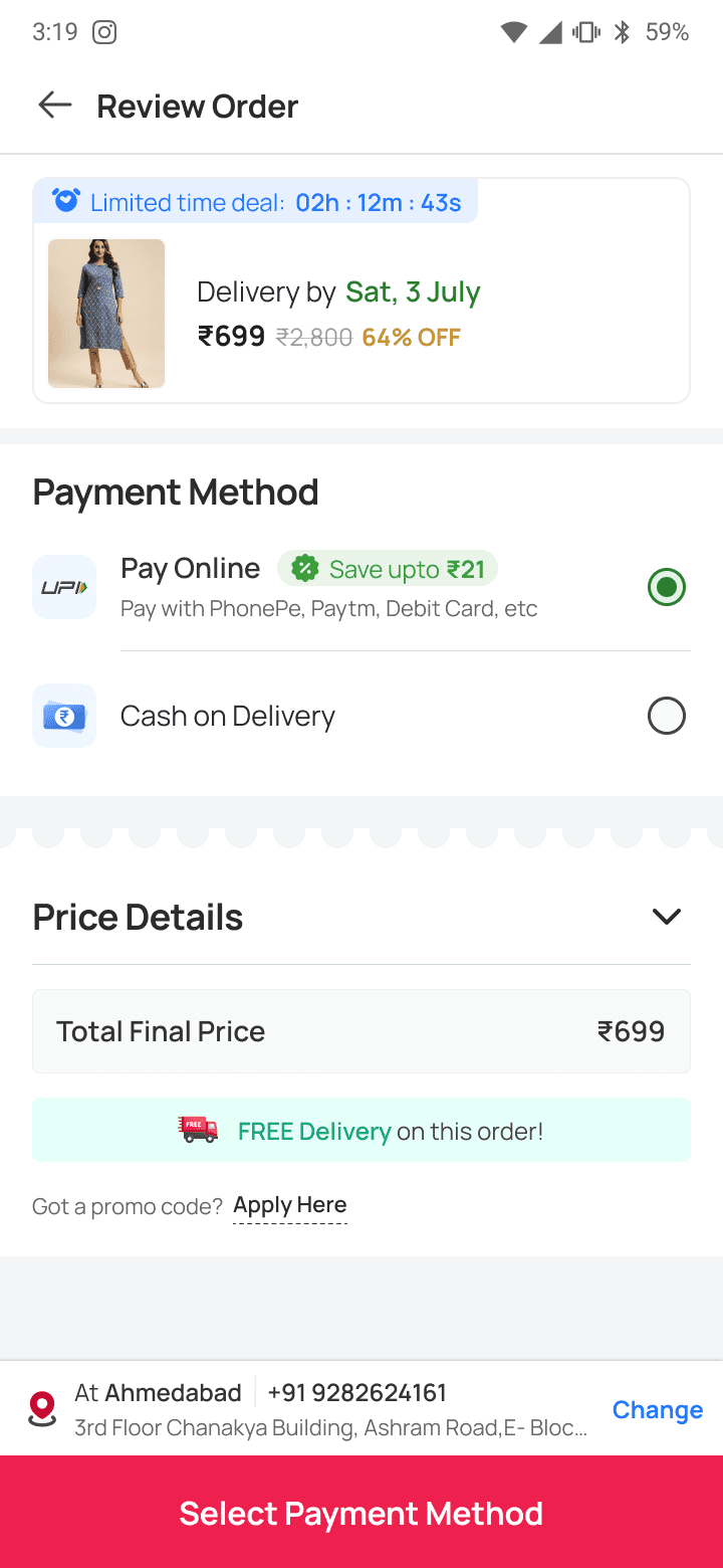 Communication for COD (Place Order) & Pay Online (Select Payment Method)