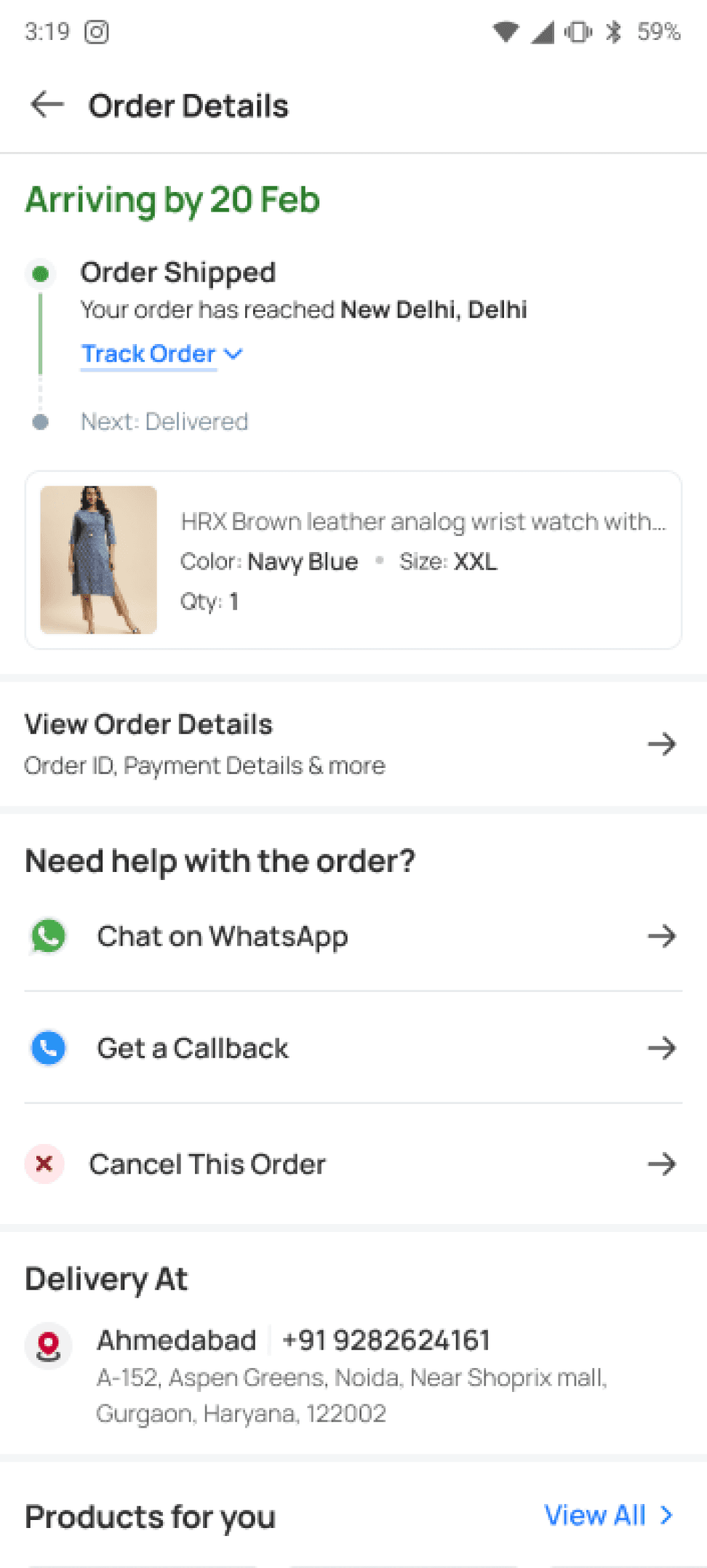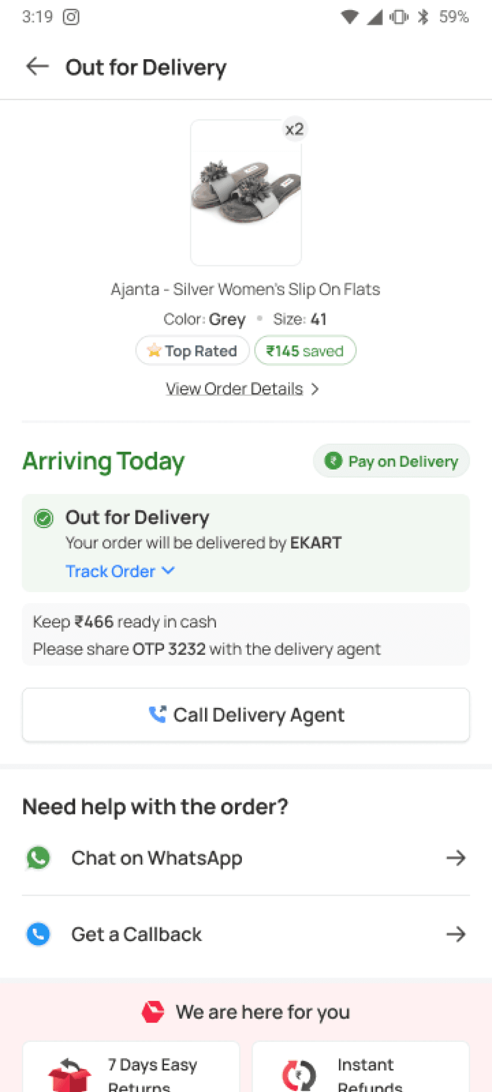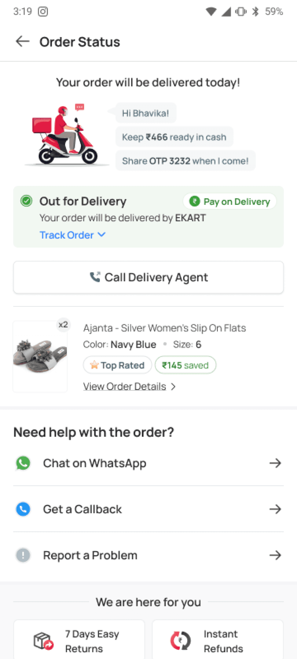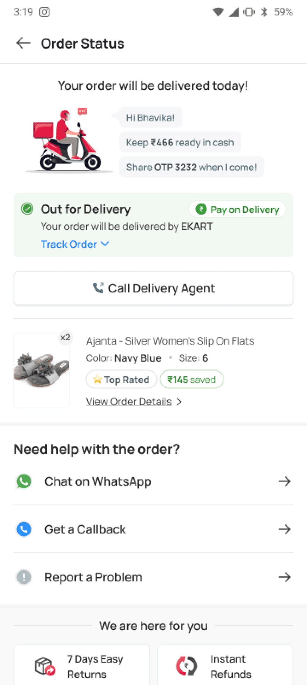 High engagement with WhatsApp updates and delivery agent calls for "Out for Delivery" stage.