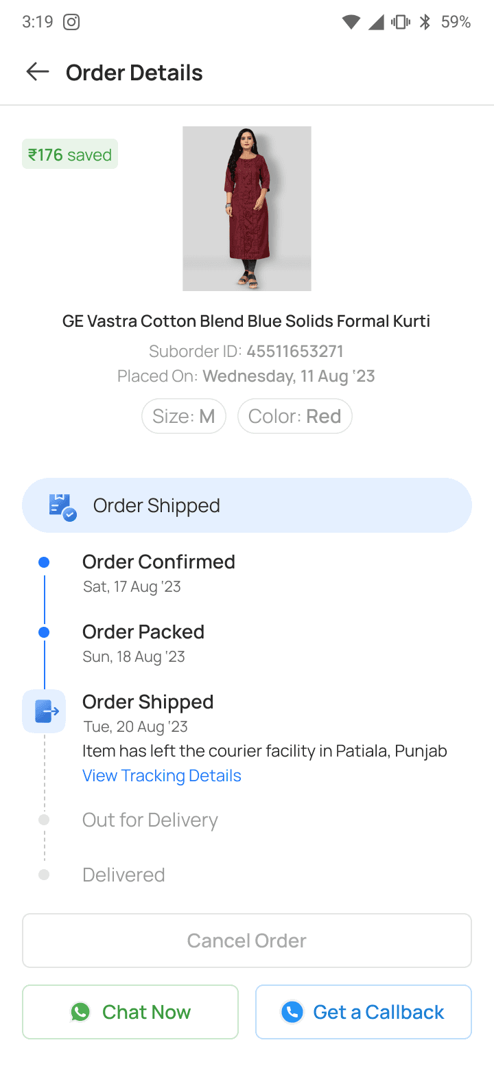 In case of out for delivery, the UI was designed to give a humanised feeling, that showed as if the delivery partner is chatting with the user. This built more trust & transparency.